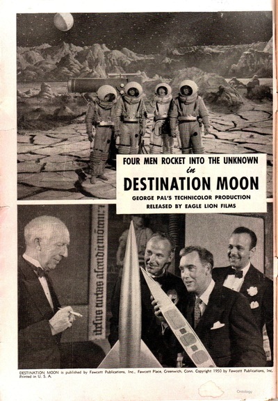 | In 1950 the genius independently filmed movie Destination Moon was released. It stood as the trail blazing sci-fi movie that genuinely tried to examine the dangers of man attempting to fly to the moon and return safely back to Earth. The movie was produced by the combined genius of producer George Pal and the prolific actor/director Irving Pichel. It was co-written by Robert A. Heinlein, based on his novel Rocket Ship Galileo. To coincide with the movie a comic book was produced to tell the story, but also inject scientific facts about travel to the moon into the story. In addition Pal included the famous cartoon character Woody Woodpecker, as he was a friend of Woody creator Walter Lantz. Woody featured in a cartoon that was shown as a short alongside Destination Moon, as well as being cleverly inserted into the the movie itself. The itself comic book stands out as a classic and early movie tie-in. |